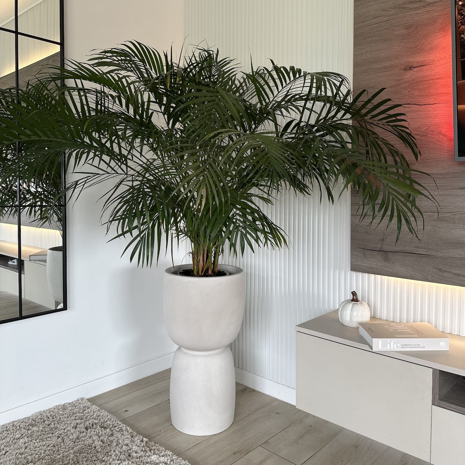 - W salonie – elegancka donica do salonu w kształcie kielicha w kolorze antracytowym lub kaszmirowym doda stylu wnętrzom urządzonym w duchu Japandi, boho czy modern classic. Ustaw ją obok sofy, przy przeszklonym wyjściu na taras lub w rogu pokoju z rośliną o wyrazistej sylwetce (np. fikusem, monsterą lub palmą areka).