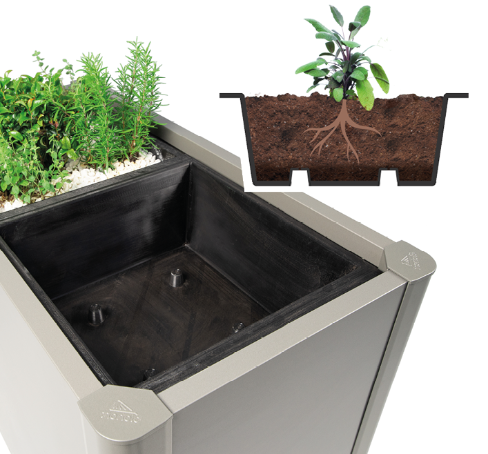 - Wkład wewnętrzny w kolorze ciemnoszarym metalicznym – ułatwiający wymianę ziemi i sadzenie roślin.