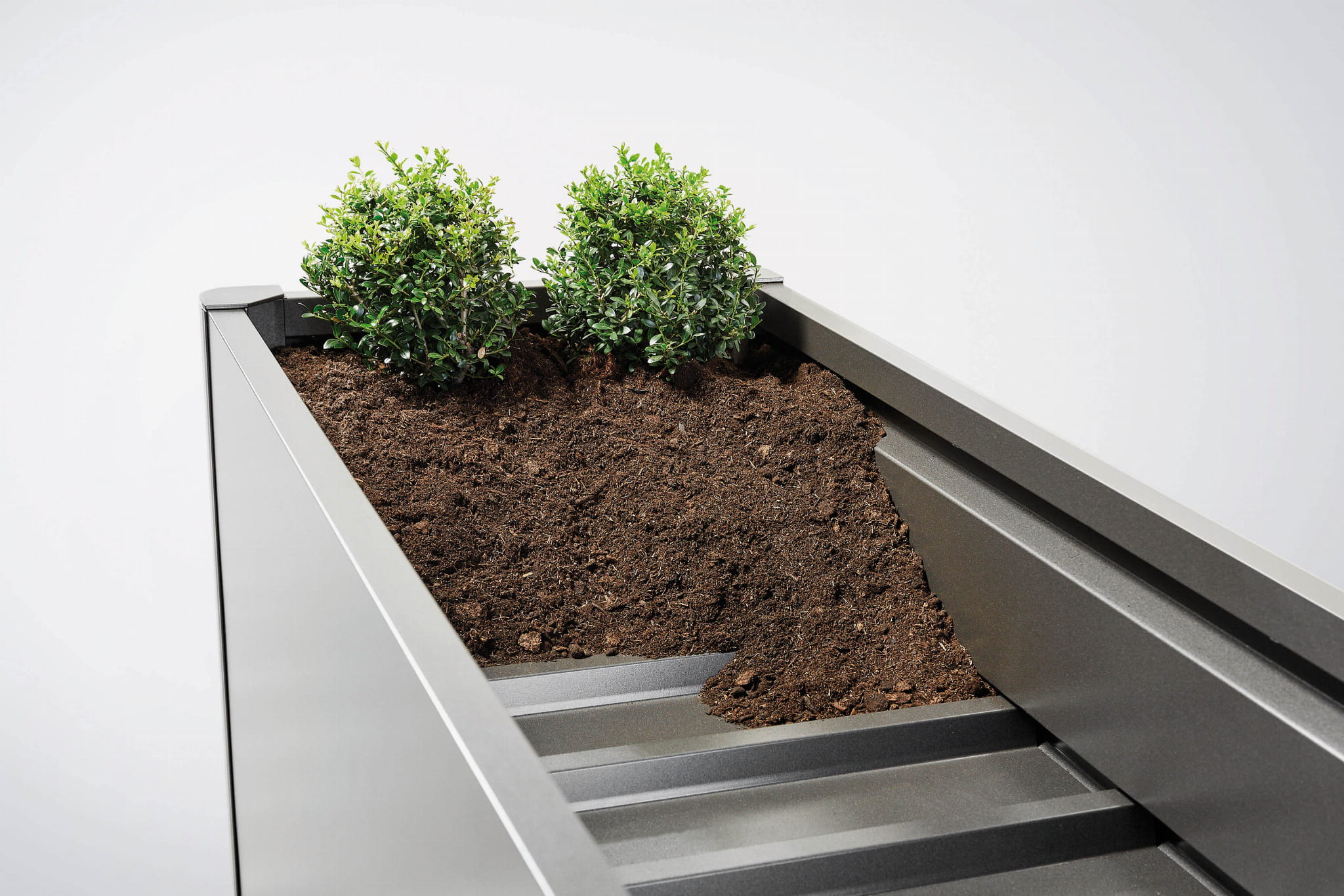 - Wkład wewnętrzny w kolorze ciemnoszarym metalicznym – ułatwiający wymianę ziemi i sadzenie roślin.