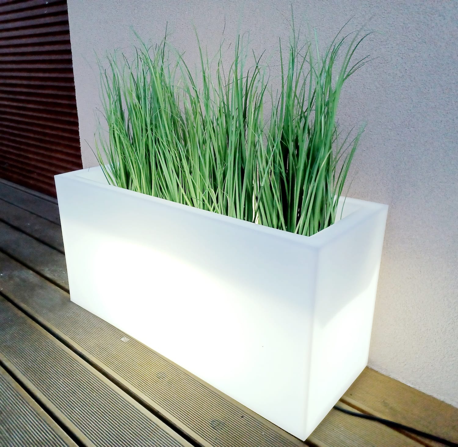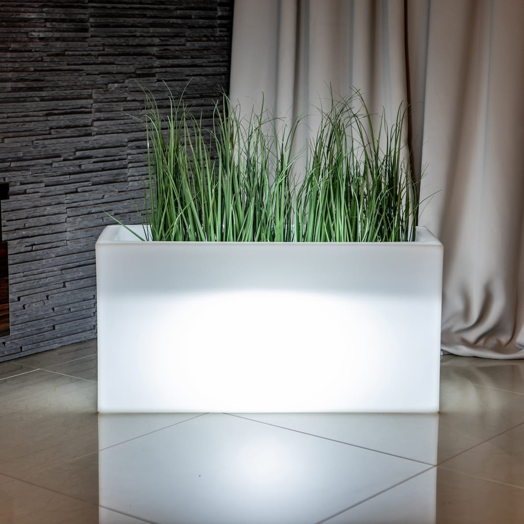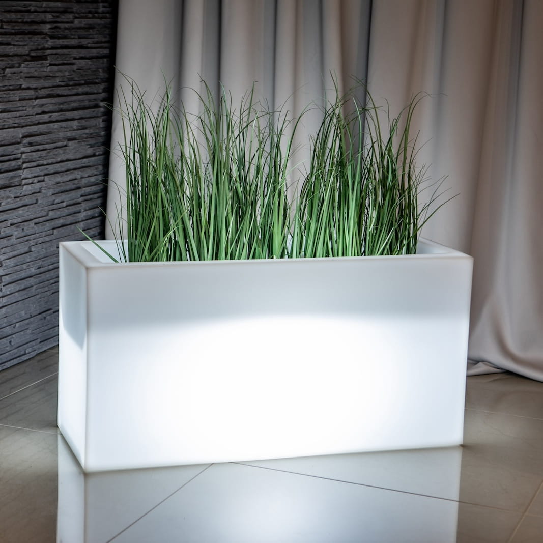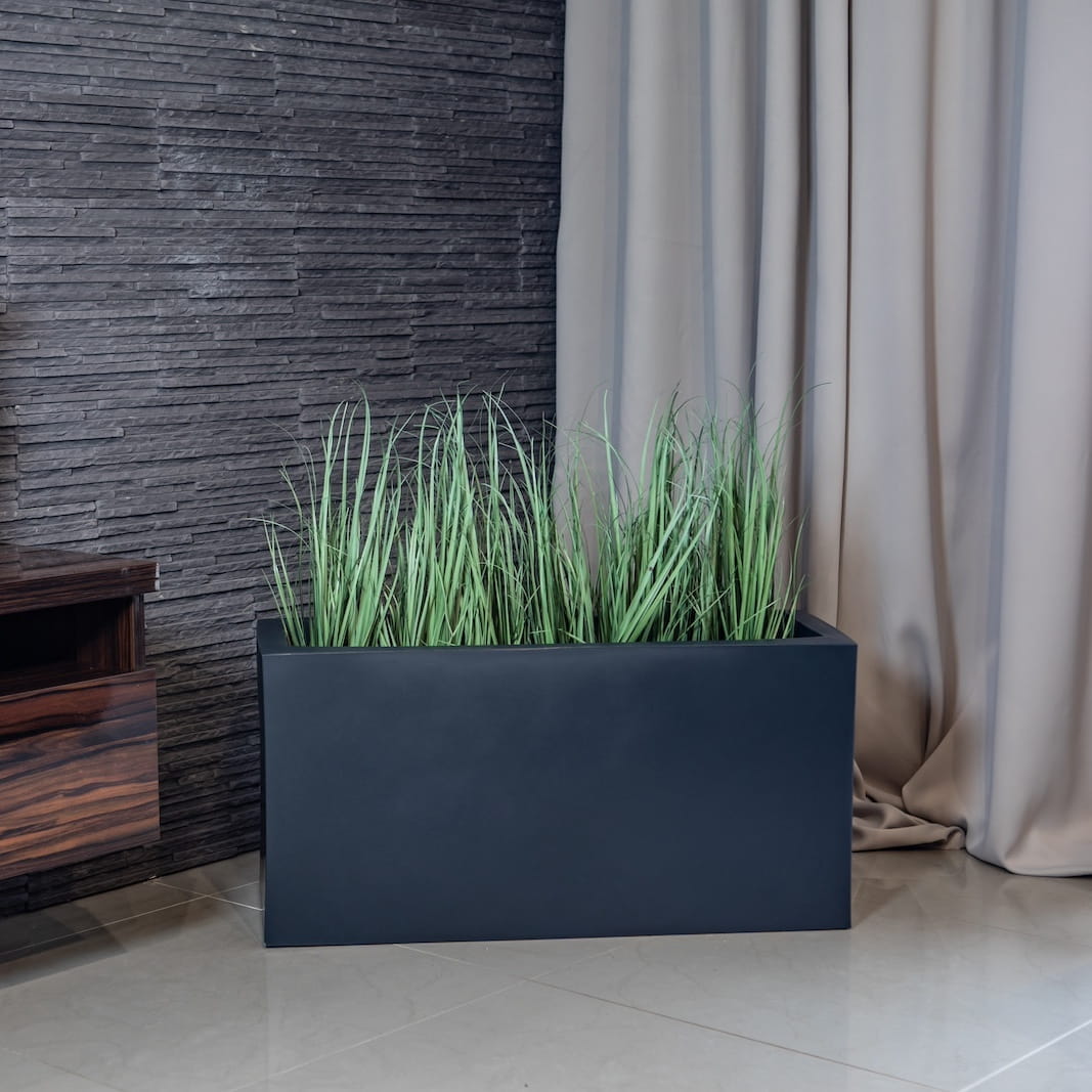 Duża prostokąta donica z wytrzymałego polietylenu sprawdza się zarówno na zewnątrz w ogrodzie, jak i w domu.