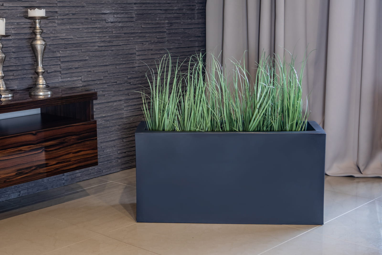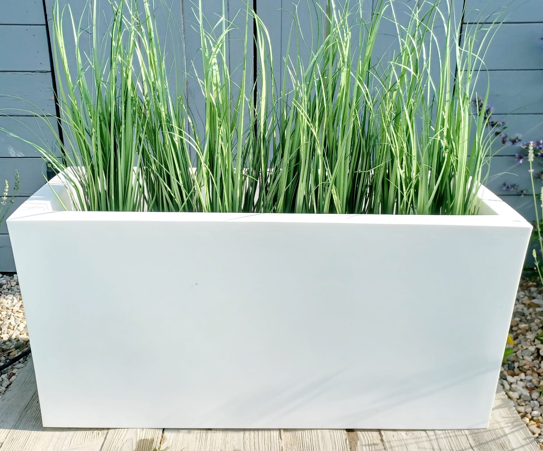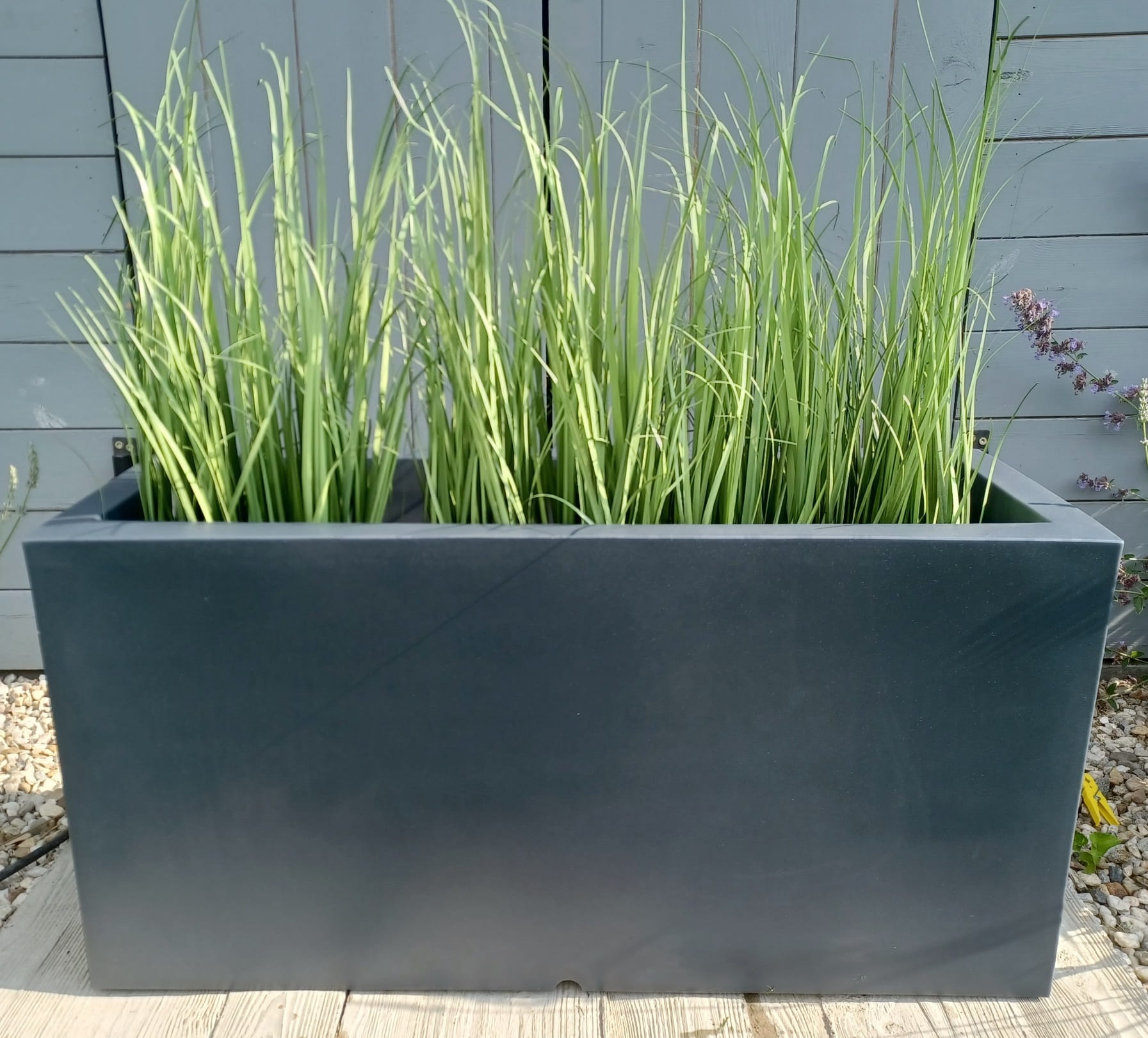 Duża prostokąta donica z wytrzymałego polietylenu sprawdza się zarówno na zewnątrz w ogrodzie, jak i w domu.