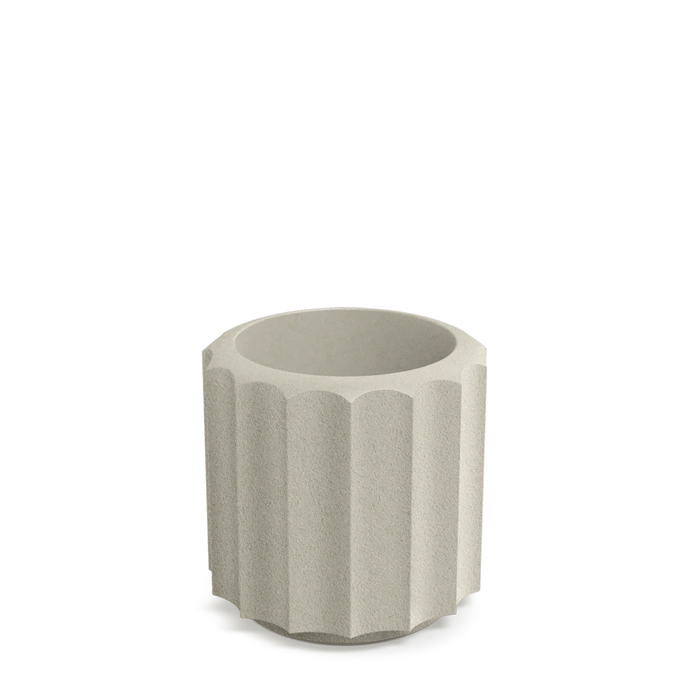 Model wyróżnia się pionowymi żłobieniami nawiązującymi do antycznych kolumn, które nadają donicy elegancji i ponadczasowego charakteru. Powierzchnia o strukturze imitującej kamień podkreśla naturalny wygląd, zachowując przy tym lekkość i praktyczność użytkowania. Dzięki harmonijnej geometrii i szerokim krawędziom donica Rona Line doskonale wpisuje się w nowoczesne aranżacje przestrzeni, zarówno prywatnych, jak i komercyjnych.