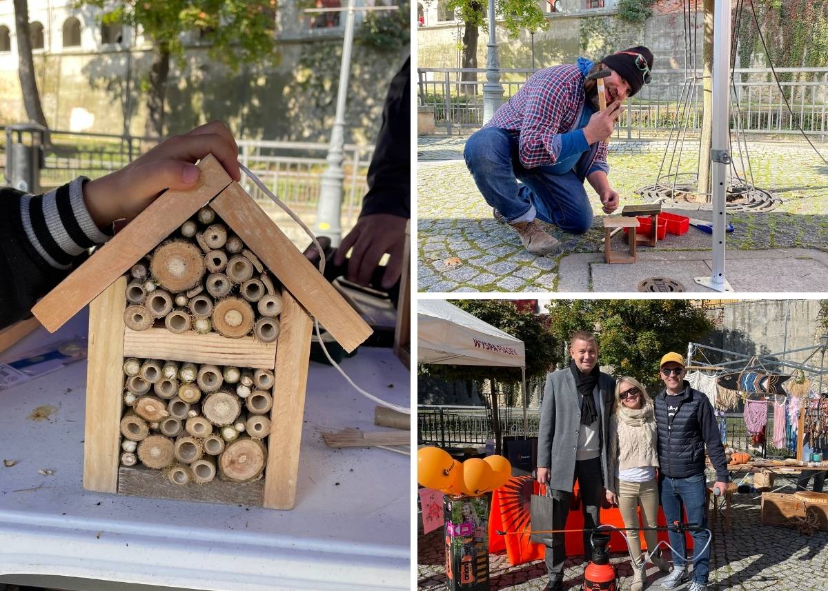 Nowością była dla nas obecność Sosny i jego sadzonek, z którym wraz z dziećmi tworzyliśmy domki dla owadów i dla jeży, a w dalszej części programowej każdy mógł wykonać dla siebie bomby kwietne. Zrobienie takiej kulki polega na zmieszaniu rękami gliny i kompostu z nasionami łąki kwietnej, dzięki czemu ptakom będzie trudniej wyjeść nasionka, a wiatr nie tak łatwo je wywieje.