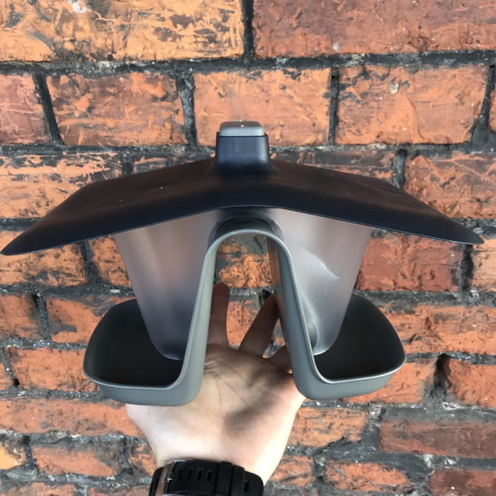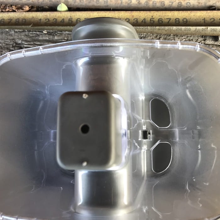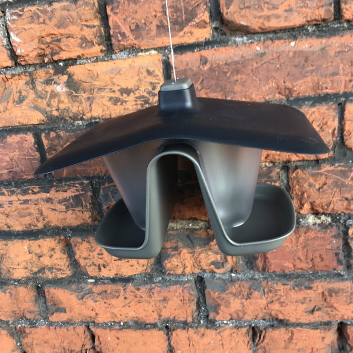 Opadający daszek zabezpiecza ziarna i przed zamoczeniem, a kształt zasypnika powoduje, że ptaki mają uzupełniany pokarm dzięki grawitacji.