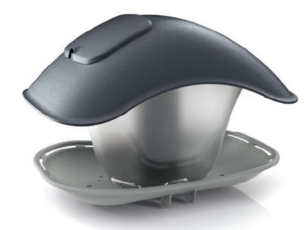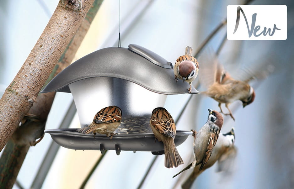 Opadający daszek zabezpiecza ziarna i przed zamoczeniem, a kształt zasypnika powoduje, że ptaki mają uzupełniany pokarm dzięki grawitacji.