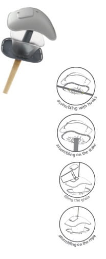 Konstrukcja Karmnika została bardzo dokładnie przemyślana - bardzo się go łatwo uzupełnia, a dziurkowana podstawa pozwala na odprowadzenie paproszków oraz okruchów niezjedzonych ziaren. Dzięki dołączonej metalowej linki z zaczepem zamontowanie go zajmie mniej niż minutę. Zmyślny kształt umożliwia również przymocowanie karmnika na drewnianym trzonku w bardzo łatwy sposób.