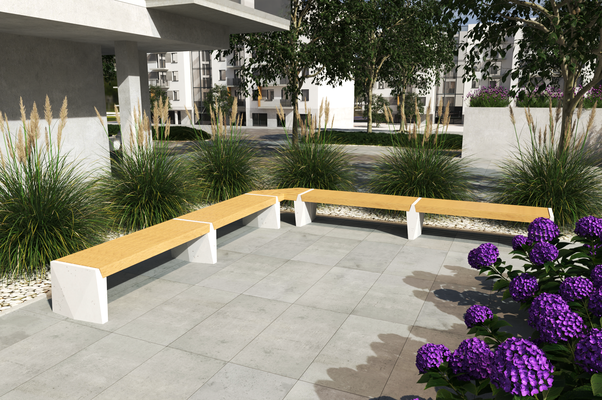 Minimalistyczna, geometryczna forma ławki doskonale wpisuje się w współczesne aranżacje przestrzeni publicznych. Betonowy korpus w połączeniu z drewnianym siedziskiem nadaje jej unikalny, surowo-elegancki charakter, który przyciąga wzrok i dodaje przestrzeniom miejskim nowoczesności.