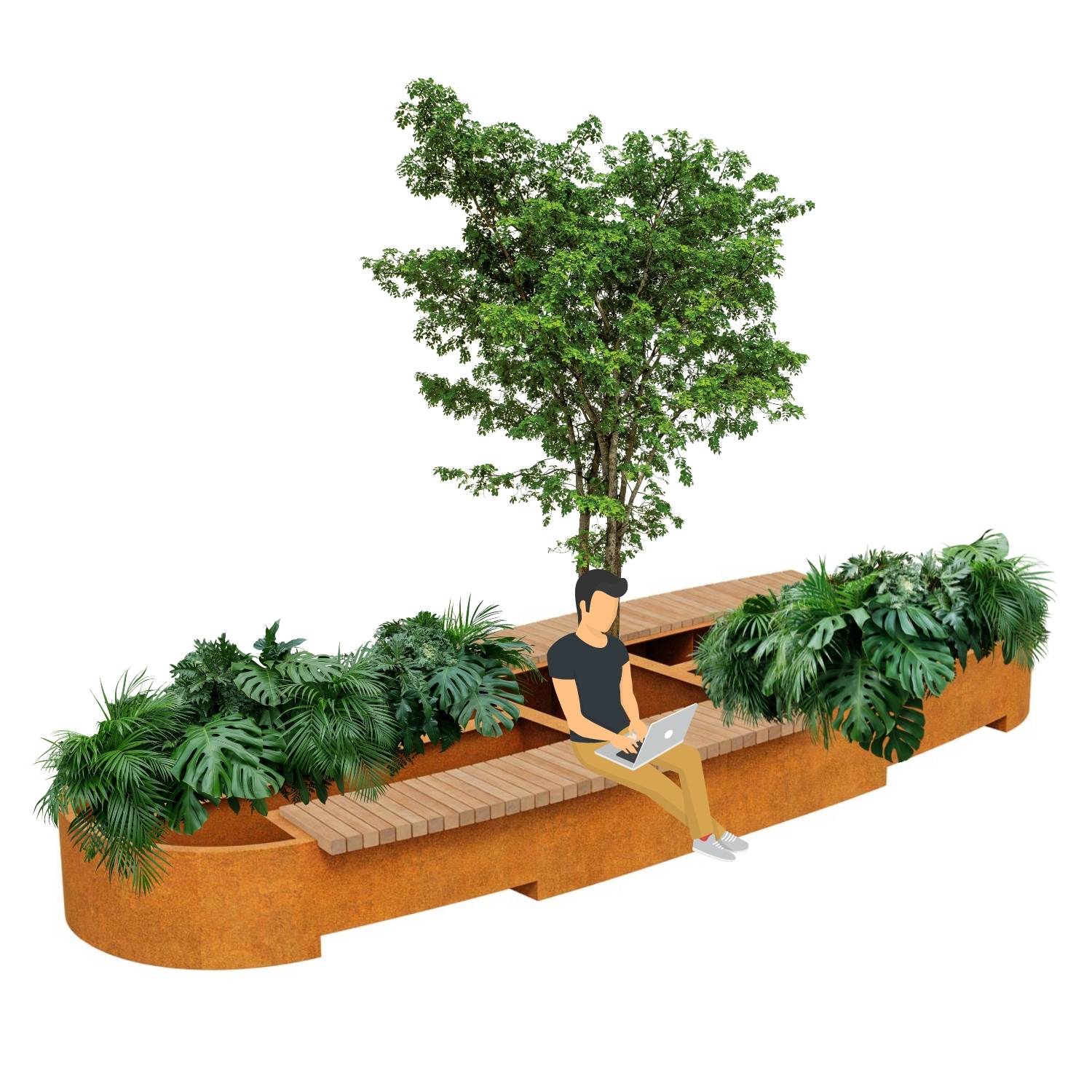 Ogromna donica posiadającą bardzo dużo miejsca na nasadzenie bardzo dużych roślin oraz wielu kompozycji roślinnych w kilku połączonych ze sobą pojemnikach oraz dwóch drewnianych ławek. Daje to możliwość nie tylko pięknej aranżacji sporej przestrzeni, ale także ogrom uciechy z zasiadania wśród nasadzonej w donicach roślinności. Produkt BASTIDOR 4 gotowy jest do 7 tygodni, jednak dostarczany jest on do klienta w stanie surowej stali cortenowej która dopiero pod wpływem czynników atmosferycznych pokrywa się rudawym nalotem tworząc niepowtarzalną fakturę zdobiąca przestrzeń.
