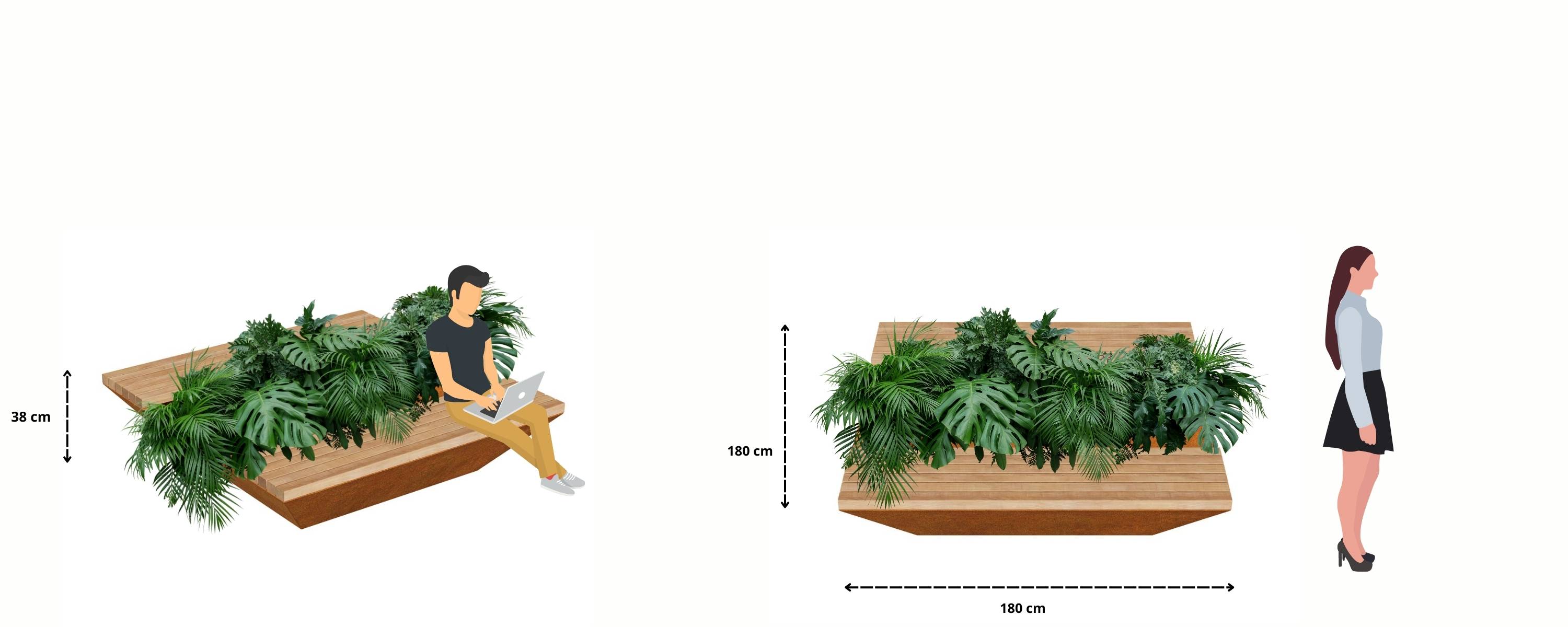 Pojemna donica o formie kwadratu zwężającego się ku podstawy o wymiarach 180 x 180 cm i wysokości 38 cm zbudowanego z długożywotnej stali Cortenowej, która pod wpływem czynników zewnętrznych zmienia się w rdzawą fakturę materiału. Chropowata struktura z rudawym nalotem tworzy n donicy niepowtarzalne wzory wpasowujące się w każdy nowocześnie zaprojektowany rynek lub okolicę, która ma być użytkowana przez przechodniów. Donica jest dodatkowo wyposażona w ławki, przez co donica staje się podwójnie funkcjonalna. Deski, z których zrobione są dwie ławki po obu stronach pochodzą z drzewa świerkowego i pokrywane są lakierem zabezpieczającym. Nie wymagają więc konserwacji po zakupieniu towaru.