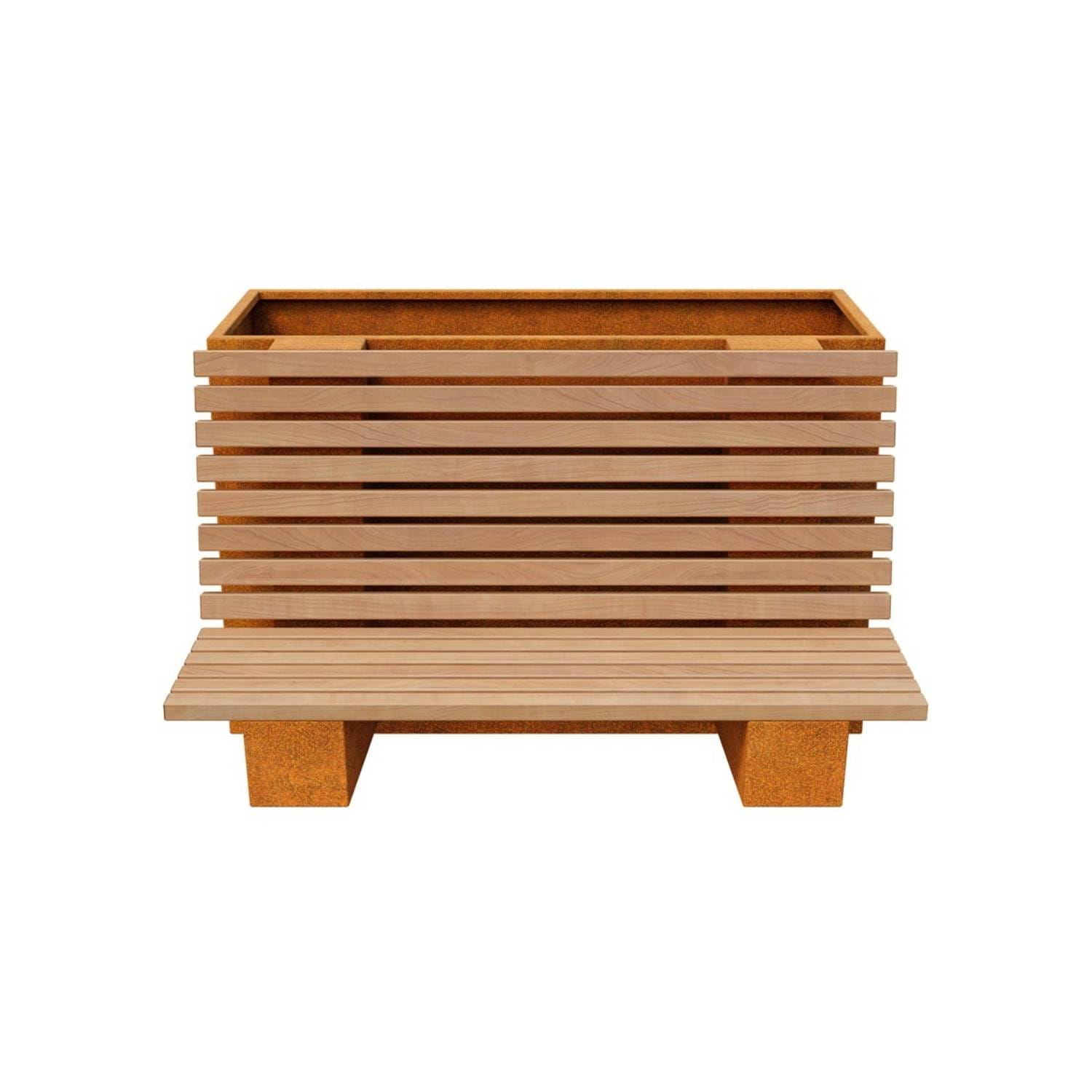 Jak nowocześnie zaaranżować wolną przestrzeń wymagającą zazielenienia a jednocześnie sprawić aby była użytkowa dla społeczności? Donica zintegrowana z drewnianą ławką BASTIDOR 6 to zdecydowanie oryginalny projekt. Zapewnia to oryginalny wygląd stali cortenowej, która pod wpływem warunków atmosferycznych zmienia fakturę powierzchni na rdzawą.