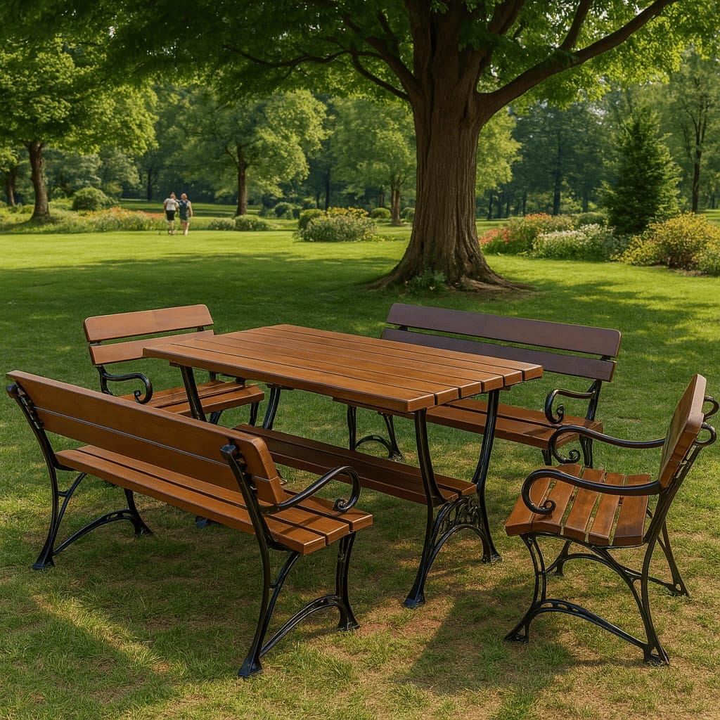 Ławki dołączone do zestawu są wykonane z tego samego rodzaju drewna co stół, co zapewnia spójność i harmonię estetyczną. Każda ławka posiada solidne siedzisko i stabilne nogi, które gwarantują wygodę i bezpieczeństwo użytkowania. Ich prosty, ale elegancki design sprawia, że doskonale komponują się ze stołem, tworząc idealne miejsce na rodzinne obiady czy spotkania z przyjaciółmi.