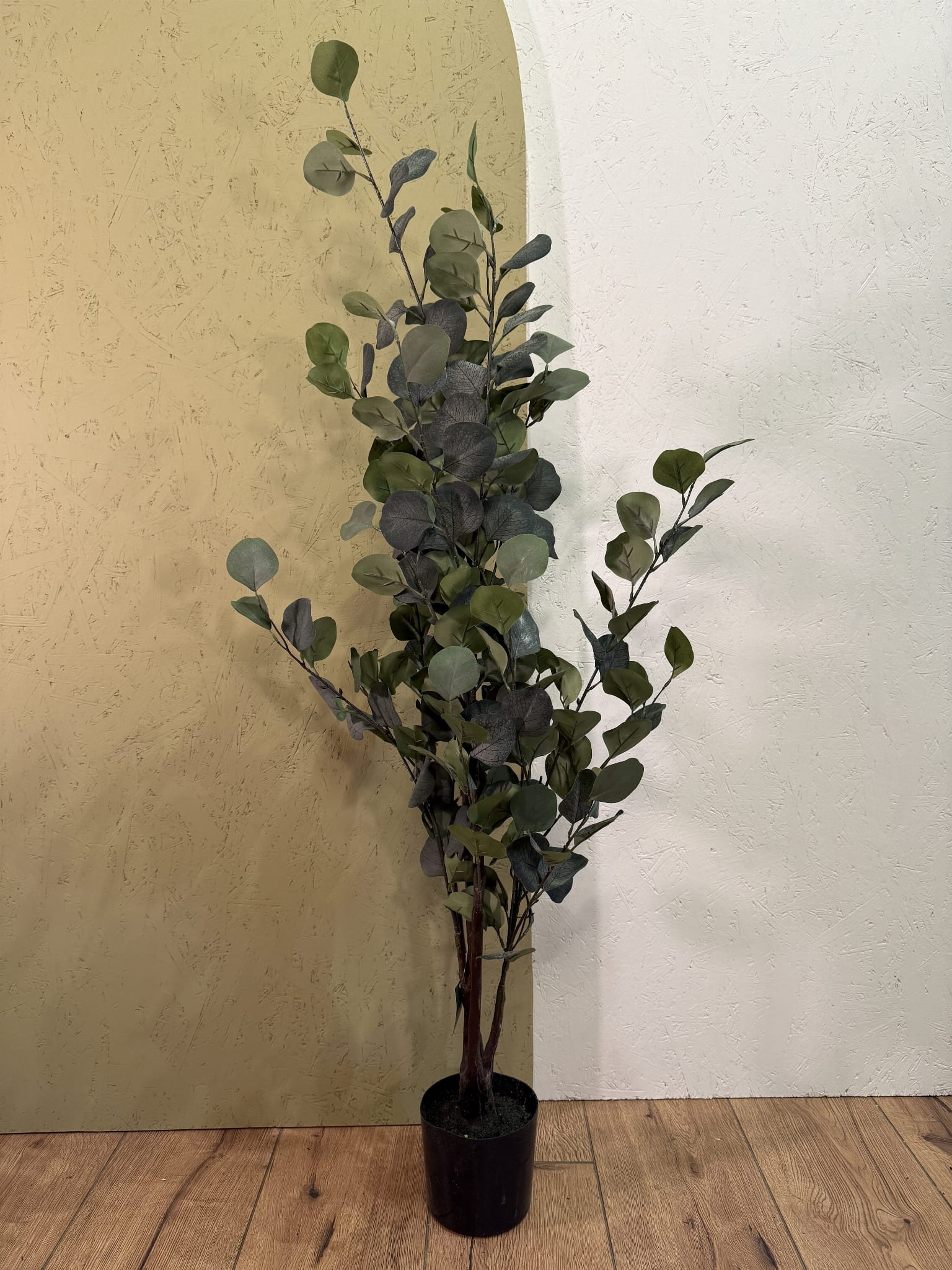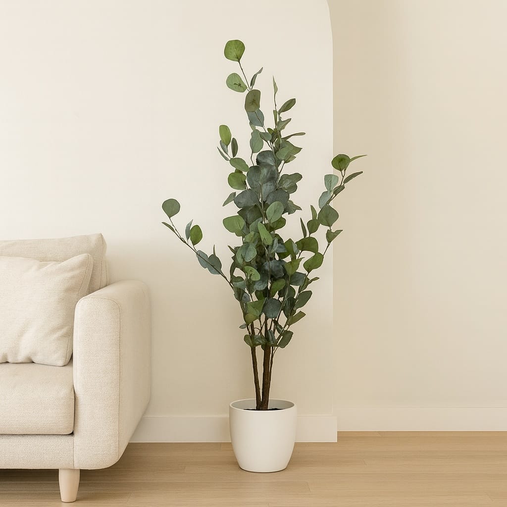 Roślina wykonana jest z wysokiej jakości materiałów, dzięki czemu wiernie imituje naturalny eukaliptus – zarówno pod względem kształtu, jak i koloru. Umieszczona w eleganckiej doniczce stanowi gotową dekorację, którą można postawić w salonie, kuchni, łazience, biurze czy na tarasie.