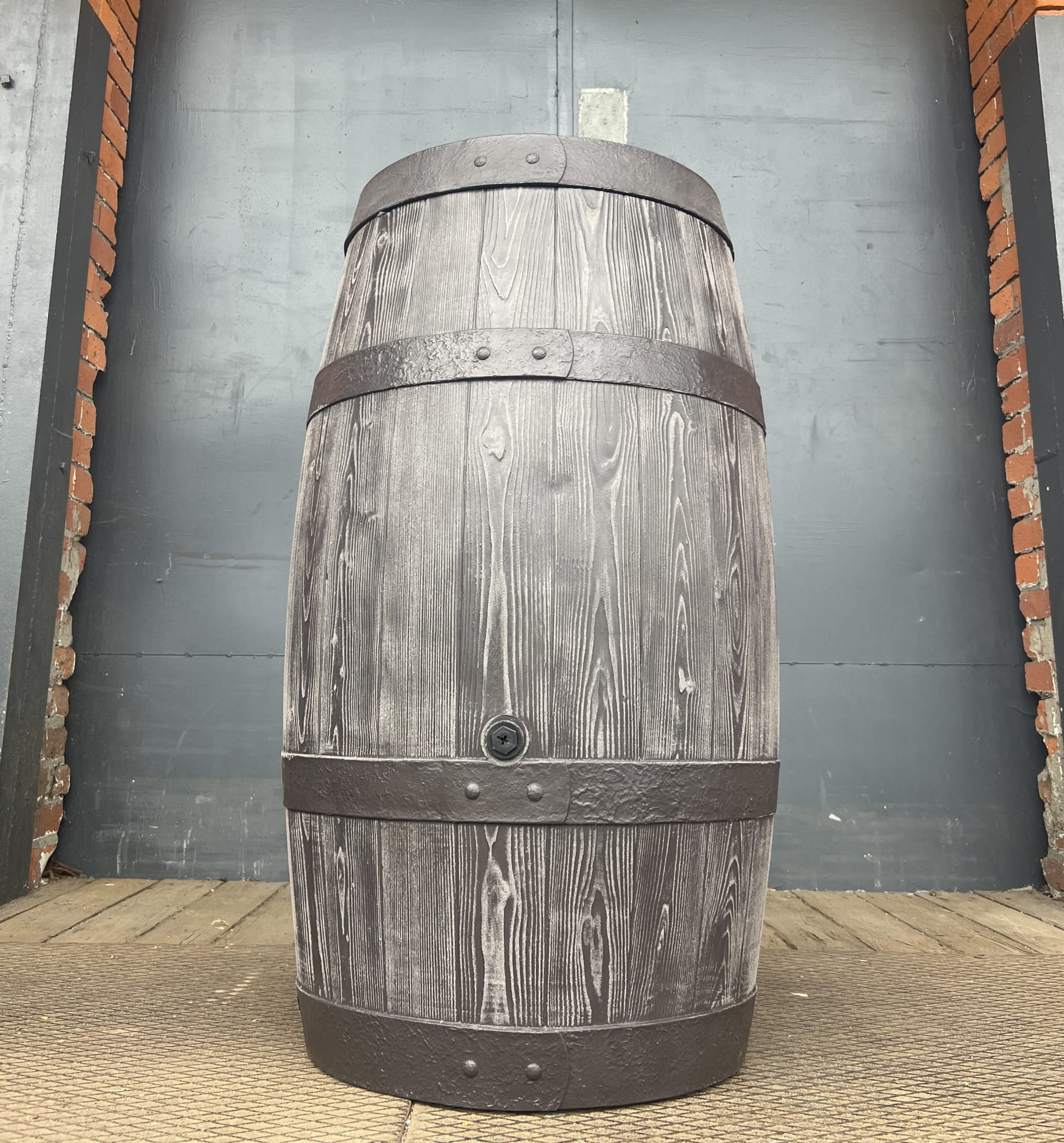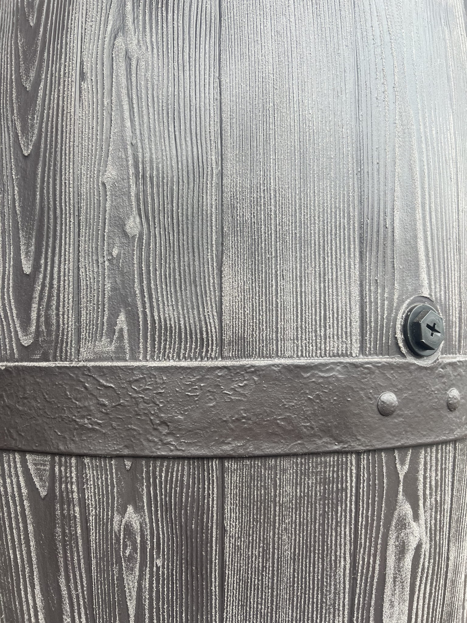 Beczka z tworzywa sztucznego, która z kilku metrów nie jest do odróżnienia od drewnianej beczki.