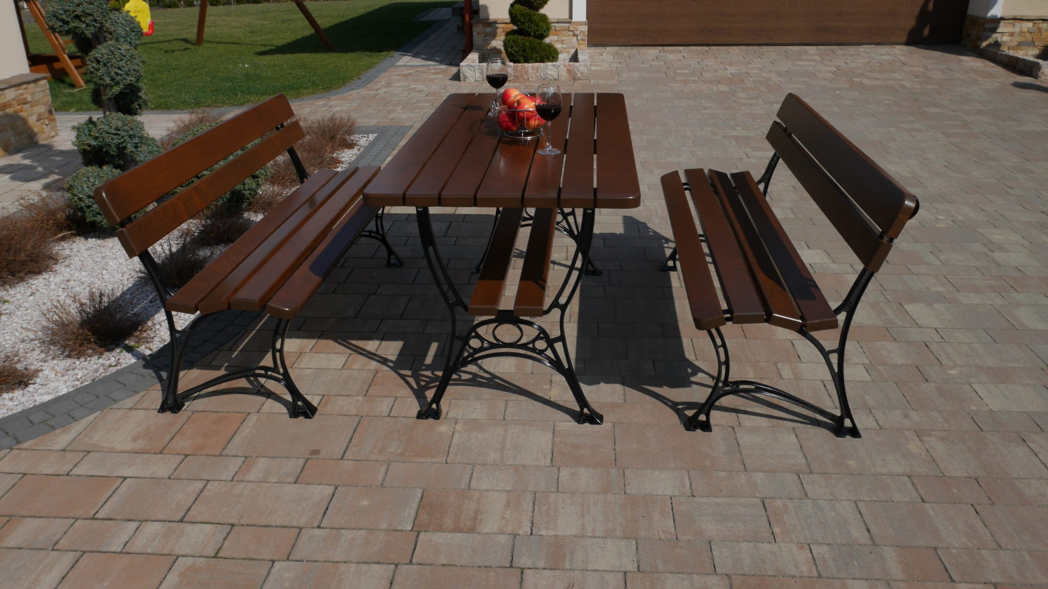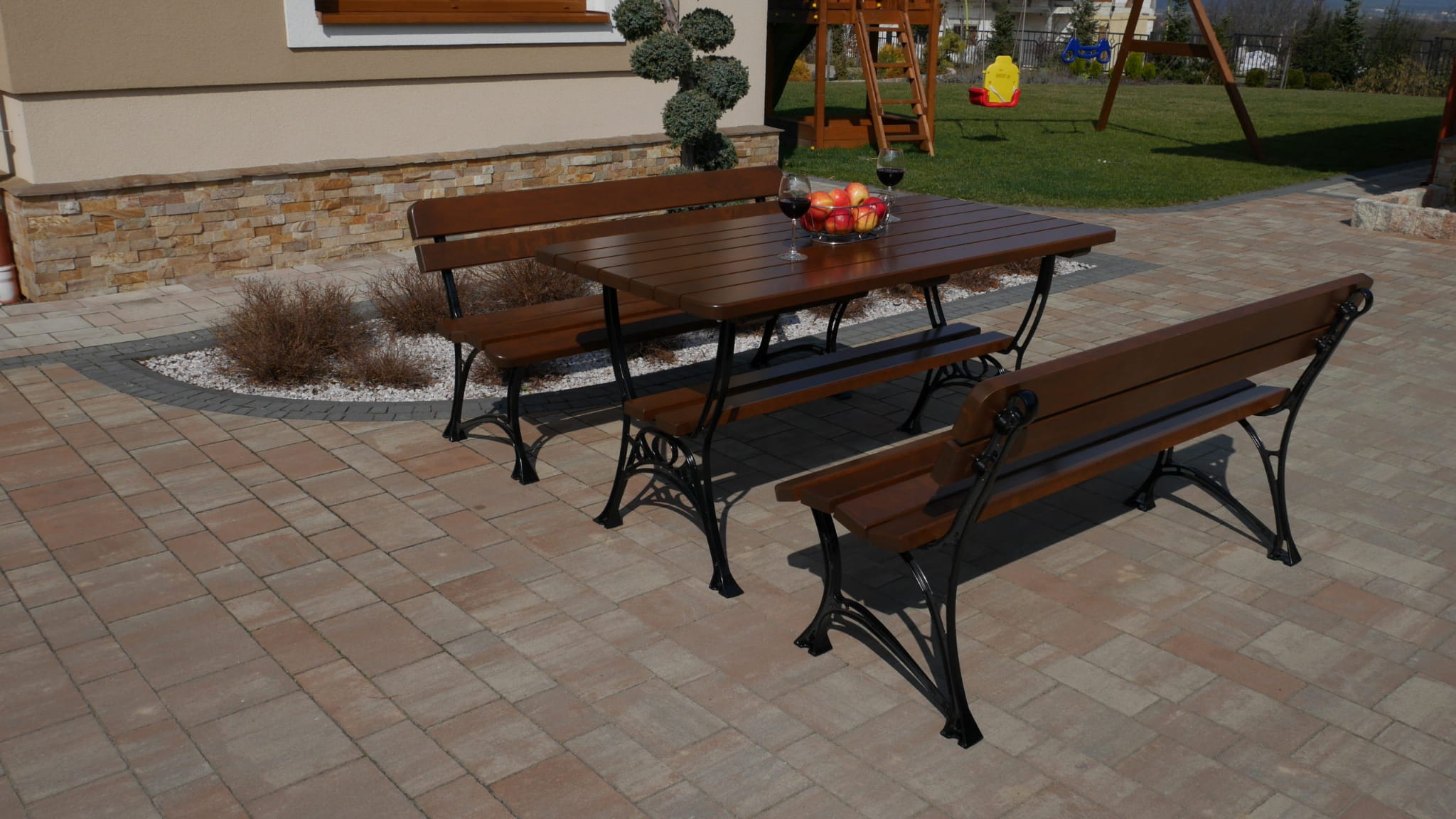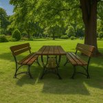Ławki dołączone do zestawu są wykonane z tego samego rodzaju drewna co stół, co zapewnia spójność i harmonię estetyczną. Każda ławka posiada solidne siedzisko i stabilne nogi, które gwarantują wygodę i bezpieczeństwo użytkowania. Ich prosty, ale elegancki design sprawia, że doskonale komponują się ze stołem, tworząc idealne miejsce na rodzinne obiady czy spotkania z przyjaciółmi.