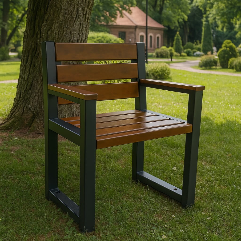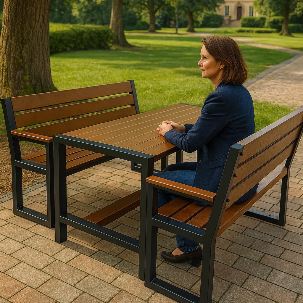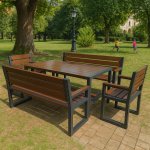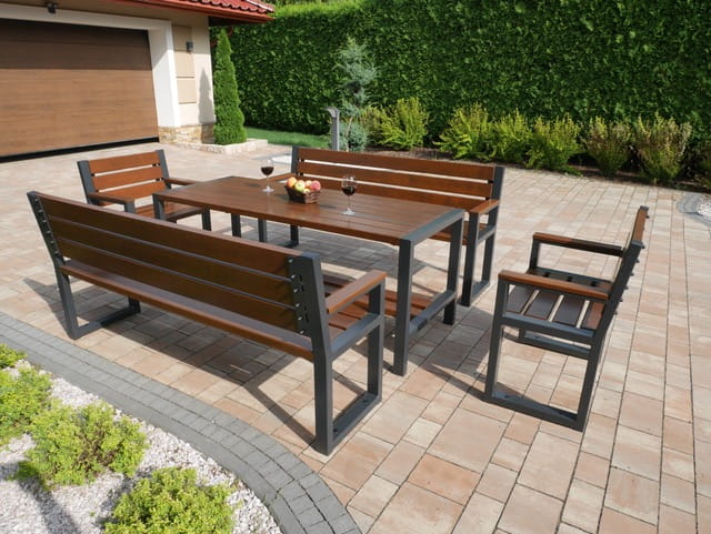 Komplet nowoczesnych mebli ogrodowych - stół + dwie ławki z oparciem i podłokietnikami + dwa krzesła z oparciem i podłokietnikami